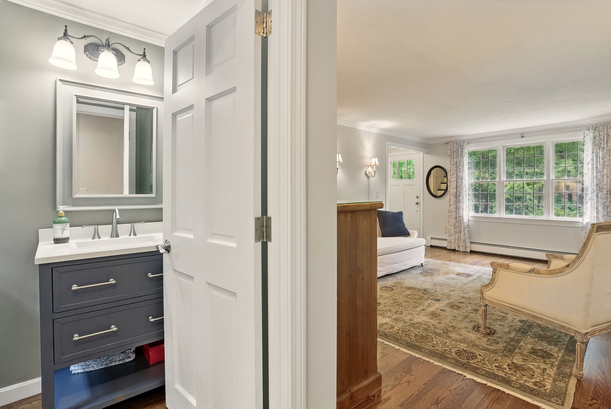 A must have remodeled kitchen with abundant granite counters, two sinks, stainless steel appliances ‘24/’25, custom cabinets, wine refrigerator, gas cooking and views makes this the heart of the home for family time & entertaining. A family room with attractive fireplace, spacious living room, elegant dining room, cozy home office with wood stove & inspiring natural light & convenient mudroom completes the impeccable 1st floor.